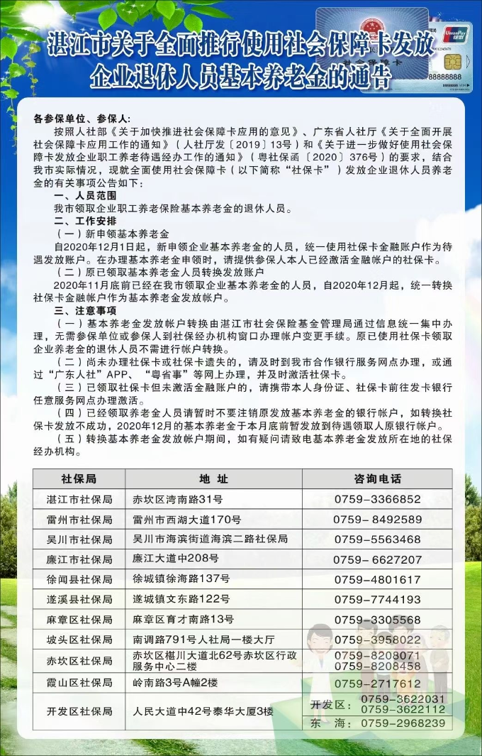 12月2日,記者從市社保局了解到,根據(jù)人社部、省人社廳、省社保局文件要求,結(jié)合我市實(shí)際,決定從2020年12月開(kāi)始,湛江市全面推行使用社保卡發(fā)放企業(yè)退休人員基本養(yǎng)老金。據(jù)介紹,本次全面推行使用社保卡涉及人員范圍為我市領(lǐng)取企業(yè)職工養(yǎng)老保險(xiǎn)基本養(yǎng)老金的退休人員。自2020年12月1日起,新申領(lǐng)企業(yè)基本養(yǎng)老金的人員,統(tǒng)一使用社??ń鹑谫~戶作為待遇發(fā)放賬戶。在辦理基本養(yǎng)老金申領(lǐng)時(shí),請(qǐng)?zhí)峁﹨⒈H吮救艘呀?jīng)激活金融賬戶的社??ā?020年11月底前已經(jīng)在我市領(lǐng)取企業(yè)基本養(yǎng)老金的人員,自2020年12月起,統(tǒng)一轉(zhuǎn)換社??ń鹑谫~戶作為基本養(yǎng)老金發(fā)放賬戶。