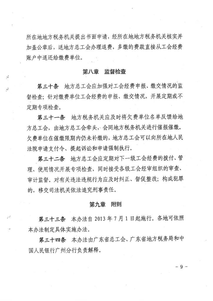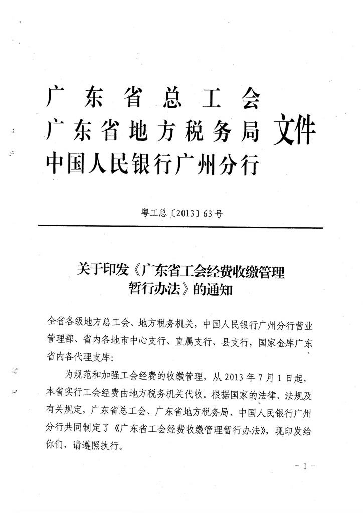 現(xiàn)將省總工會(huì)、省地稅局、人民銀行廣州分行《關(guān)于印發(fā)〈廣東省工會(huì)經(jīng)費(fèi)收繳管理暫行辦法〉的通知》(粵工總〔2013〕63號(hào))轉(zhuǎn)發(fā)給你們,同時(shí)結(jié)合我市實(shí)際,提出如下意見(jiàn),請(qǐng)一并執(zhí)行。