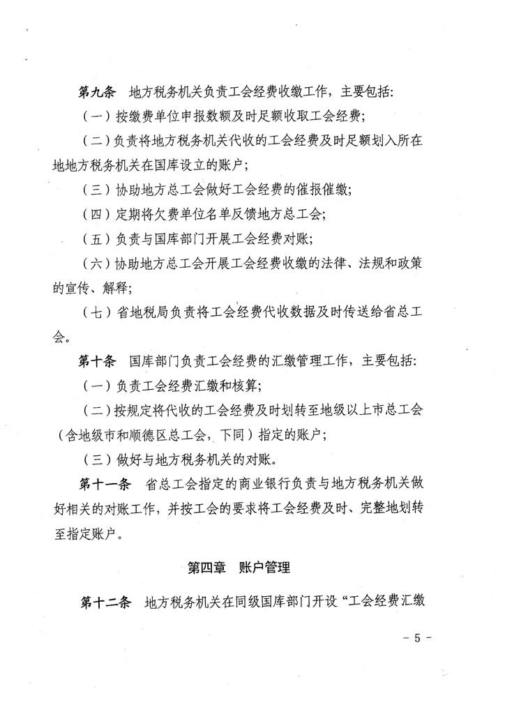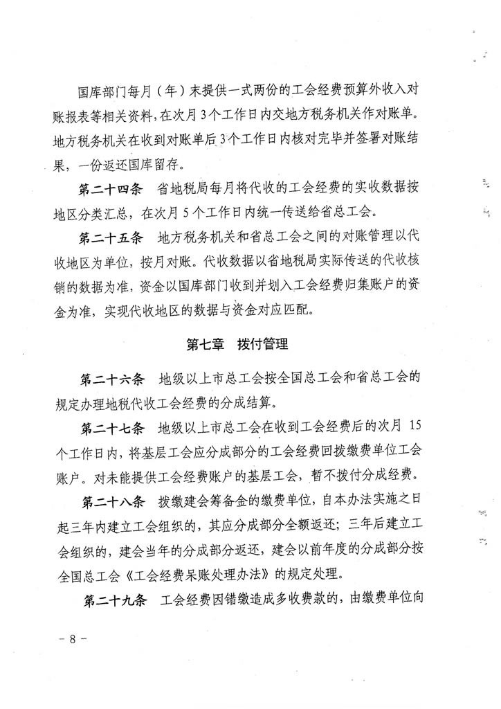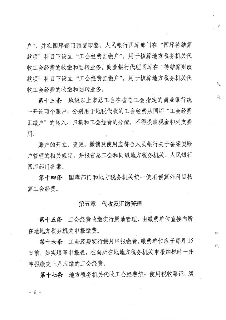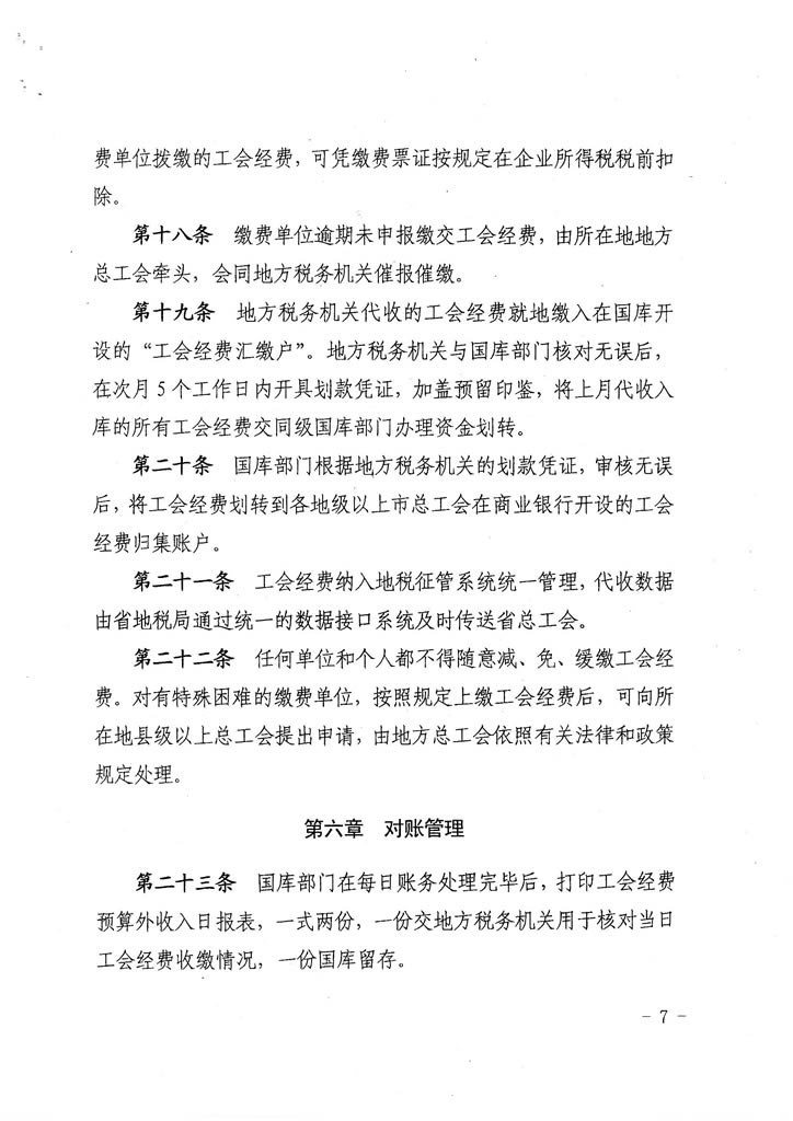 六、地稅機(jī)關(guān)代收的工會(huì)經(jīng)費(fèi)就地繳入在國(guó)庫(kù)開(kāi)設(shè)的“工會(huì)經(jīng)費(fèi)匯繳戶(hù)”。地稅機(jī)關(guān)與國(guó)庫(kù)部門(mén)核對(duì)無(wú)誤后,在次月5個(gè)工作日內(nèi)開(kāi)具劃款憑證,加蓋預(yù)留印鑒,送交同級(jí)國(guó)庫(kù)部門(mén),將上月代收入庫(kù)的所有工會(huì)經(jīng)費(fèi)劃轉(zhuǎn)到湛江市總工會(huì)在商業(yè)銀行開(kāi)設(shè)的“工會(huì)經(jīng)費(fèi)歸集戶(hù)”。在人民銀行國(guó)庫(kù)開(kāi)設(shè)“工會(huì)經(jīng)費(fèi)匯繳戶(hù)”的地稅機(jī)關(guān),使用中國(guó)人民銀行電匯憑證辦理劃款;在商業(yè)銀行代理國(guó)庫(kù)開(kāi)設(shè)“工會(huì)經(jīng)費(fèi)匯繳戶(hù)” 的地稅機(jī)關(guān),使用該商業(yè)銀行的電匯憑證辦理劃款。