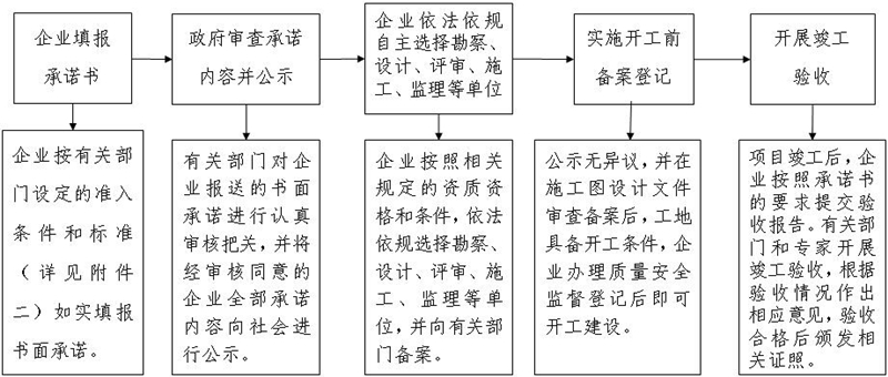 (二)辦事流程。企業(yè)在取得土地使用權(quán)后,依法依規(guī)作出書面承諾,自主開展勘察、設(shè)計(jì)、評審等工作。通過開工前備案登記后,便可自主開展施工,施工過程按國家強(qiáng)制性標(biāo)準(zhǔn)、產(chǎn)業(yè)政策接受全過程動態(tài)監(jiān)督,竣工后接受全面驗(yàn)收。(詳見附件1)