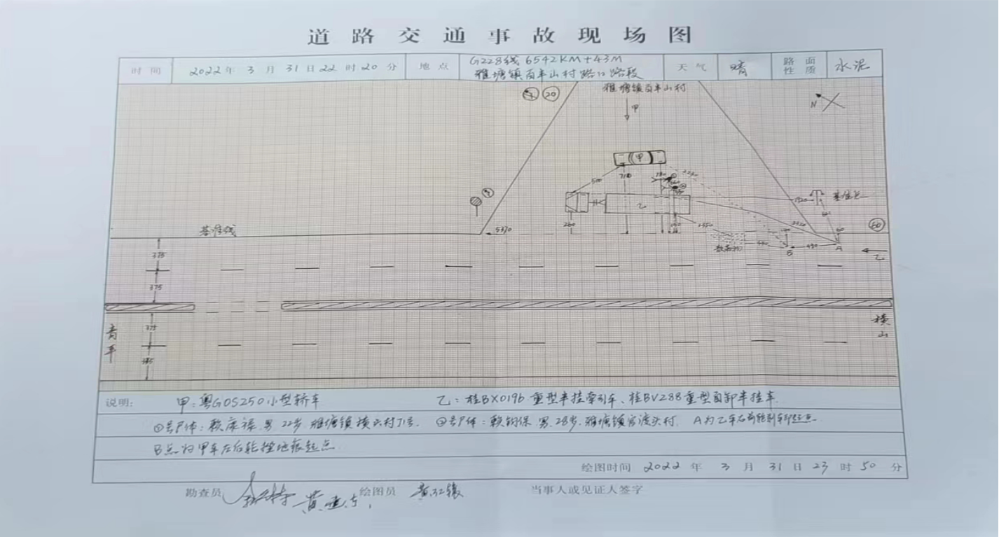 事故現場位于國道G228線6542KM+43M與鄉(xiāng)道Y158線T型交叉路口,國道G228線呈東南往西北走向,東南往橫山鎮(zhèn)方向,西北往青平鎮(zhèn)方向,雙向共四車道、中間混凝土墻分隔,水泥路面、路面完好、干燥、平直,設有T型交叉口、限速60公里、村莊標志,交通標志標線清晰。鄉(xiāng)道Y158線呈南北走向,北往雅塘鎮(zhèn)方向,南端連接國道G228線,通往國道G228線方向設有限速20公里標志、禁止左轉彎標志、減速帶(已磨損),交通標線不清晰。事發(fā)時路口有路燈照明。