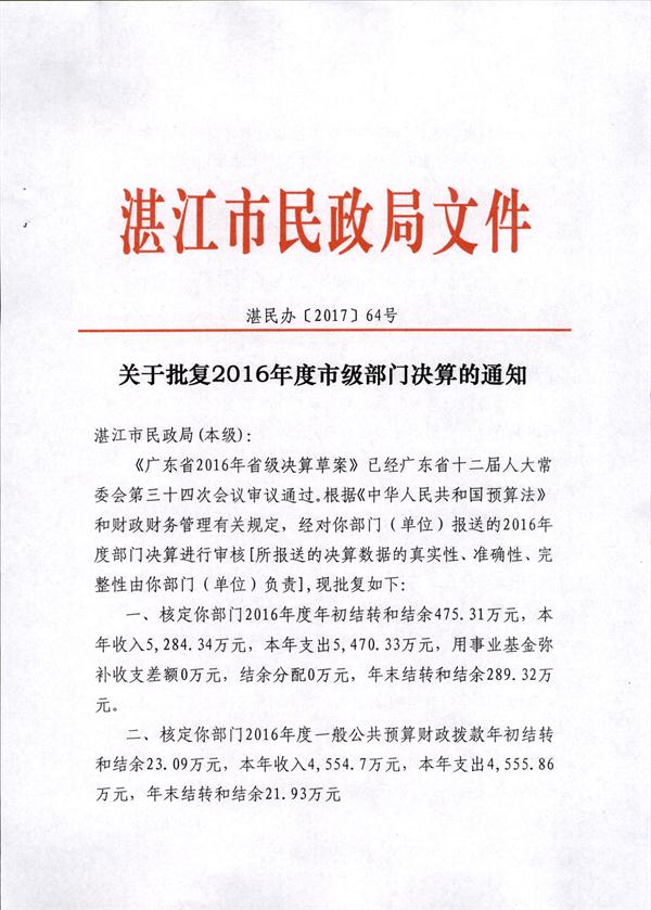 關(guān)于批復(fù)2016年度市級(jí)部門決算的通知(湛江市民政局(本部))