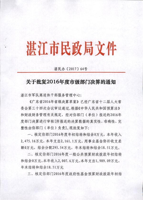 關(guān)于批復(fù)2016年度市級部門決算的通知(軍休中心)