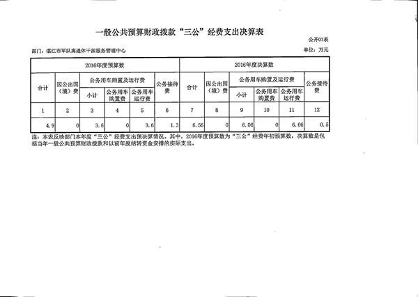 ??? “三公”經(jīng)費(fèi)包括因公出國(境)費(fèi)、公務(wù)用車購置及運(yùn)行維護(hù)費(fèi)和公務(wù)接待費(fèi)。2016年湛江軍休中心部門決算一般公共預(yù)算財(cái)政撥款“三公”經(jīng)費(fèi)支出合計(jì)6.56萬元,比上年減少0.12萬元。其中:因公出國(境)費(fèi)0萬元,公務(wù)用車購置費(fèi)0元,公務(wù)用車運(yùn)行維護(hù)費(fèi)6.06萬元,占92.37%,比上年減少0.12萬元,減少的原因主要是2016年根據(jù)公車改革規(guī)定,嚴(yán)格控制公車運(yùn)行費(fèi)用;2016年無公務(wù)用車購置;公務(wù)接待費(fèi)0.5萬元,占0.07%,與上年持平,原因主要是嚴(yán)格執(zhí)行中央八項(xiàng)規(guī)定,嚴(yán)控公務(wù)接待開支。2016年國內(nèi)公務(wù)接待4批次,接待60人次。