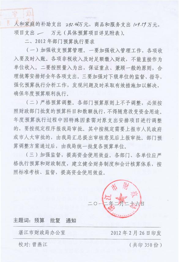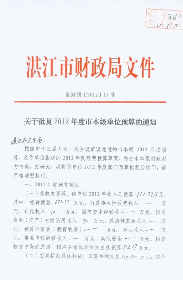 關(guān)于批復(fù)2012年度本級單位預(yù)算通知