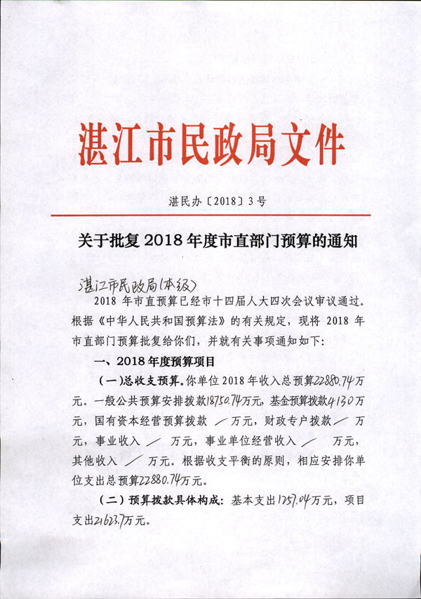 關(guān)于批復(fù)2018年度市直部門預(yù)算的通知(湛江市民政局)