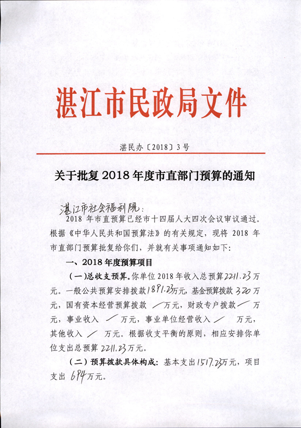關(guān)于批復(fù)2018年度市直部門預(yù)算的通知(湛江市福利院)