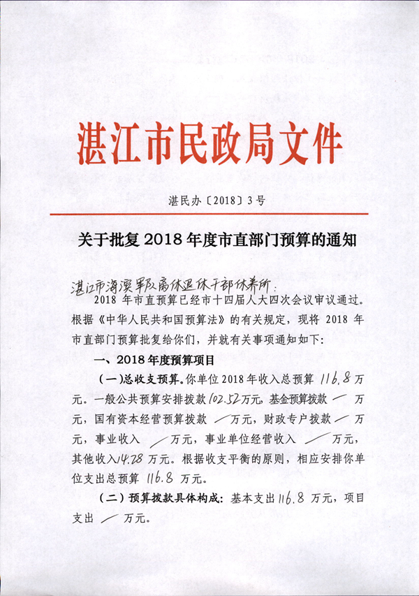 關(guān)于批復(fù)2018年度市直部門預(yù)算的通知(湛江市海濱軍休所)