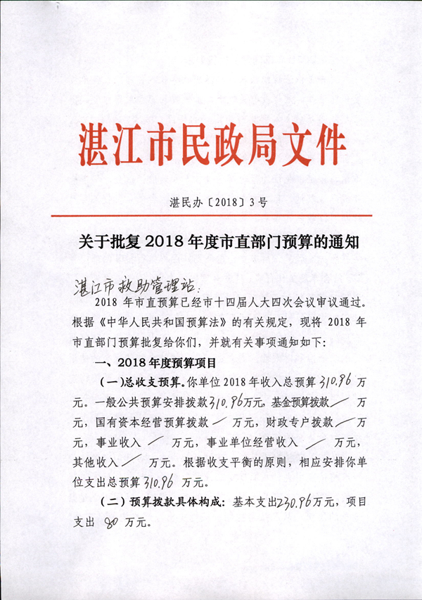 關(guān)于批復(fù)2018年度市直部門預(yù)算的通知(湛江市救助站)