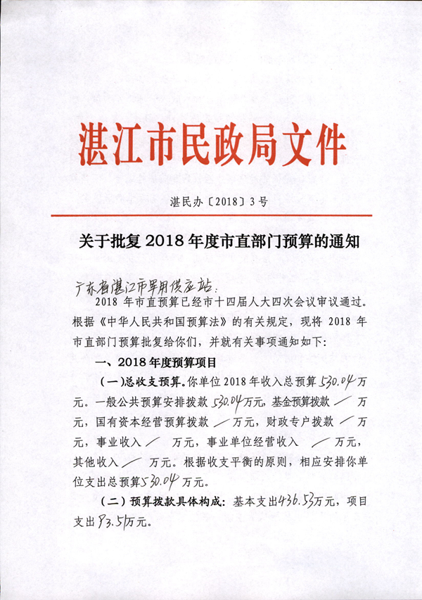 關于批復2018年度市直部門預算的通知(廣東省湛江市軍用供應站)