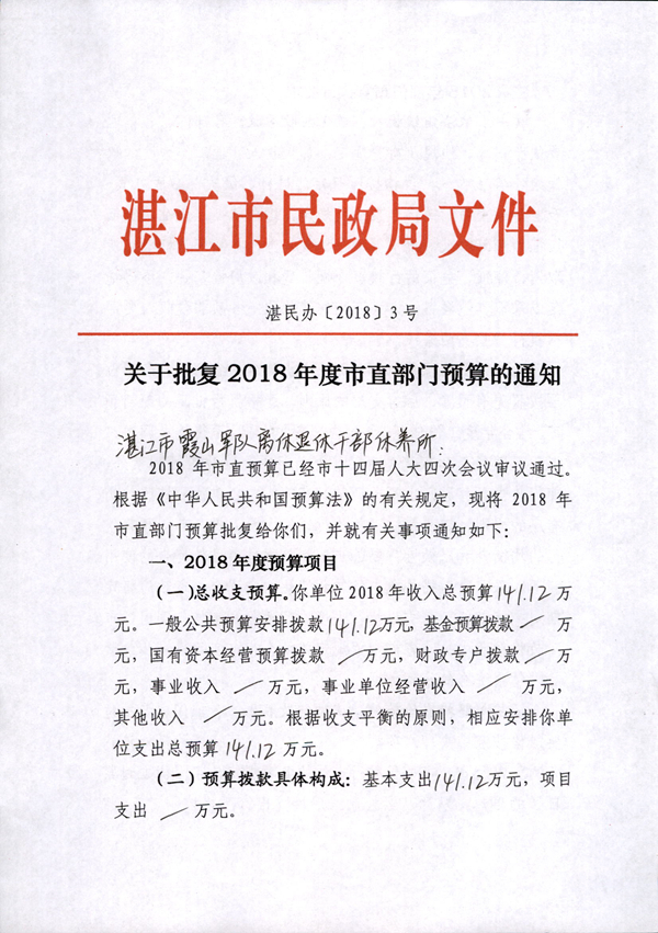 關于批復2018年度市直部門預算的通知(湛江市霞山軍休所)