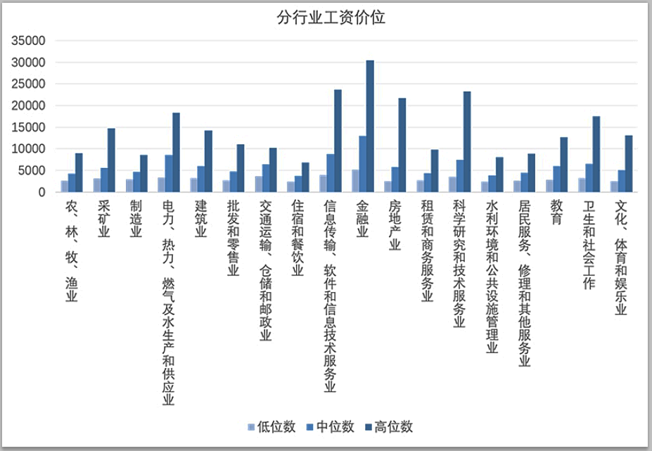 從行業(yè)來看,金融業(yè)、信息傳輸、軟件和信息服務(wù)業(yè)繼續(xù)領(lǐng)跑。工資水平中位數(shù)最高的三個行業(yè)依次為金融業(yè)12974元/月,信息傳輸、軟件和信息技術(shù)服務(wù)業(yè)8769元/月,電力、熱力、燃?xì)饧八a(chǎn)和供應(yīng)業(yè)8508元/月。相對較低的三個行業(yè)分別是住宿和餐飲業(yè)3772元/月、水利環(huán)境和公共設(shè)施管理業(yè)3851元/月、農(nóng)林牧漁業(yè)4200元/月。