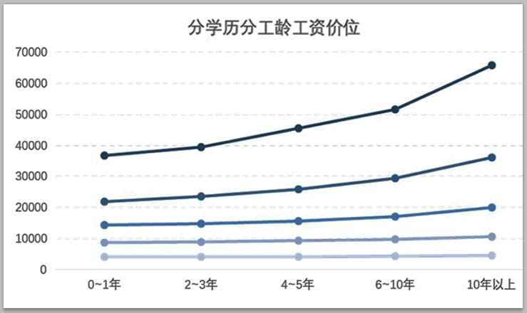 從學(xué)歷來看,總體上職工工資與學(xué)歷呈正相關(guān)關(guān)系,即隨著學(xué)歷的提升,職工工資逐漸提升。此外,學(xué)歷越高,職工工資增長越快。其中,研究生(含博士、碩士)學(xué)歷、10年以上工齡的職工工資最高,中位數(shù)達(dá)到21204元/月;初中及以下學(xué)歷、0~1年工齡的職工工資最低,中位數(shù)為3867元/月。