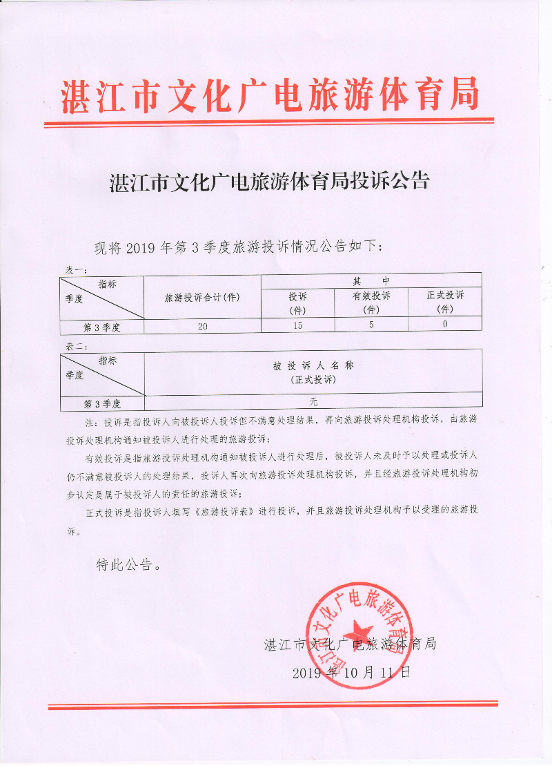 湛江市旅游投訴公告(第三季度)
