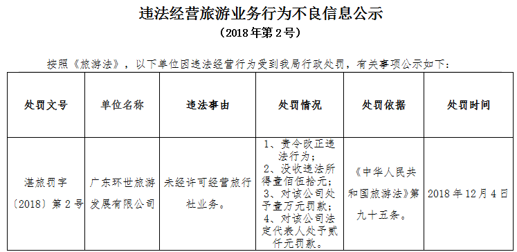 湛江市違法經(jīng)營(yíng)旅游業(yè)務(wù)行為不良信息公示(第四季度)