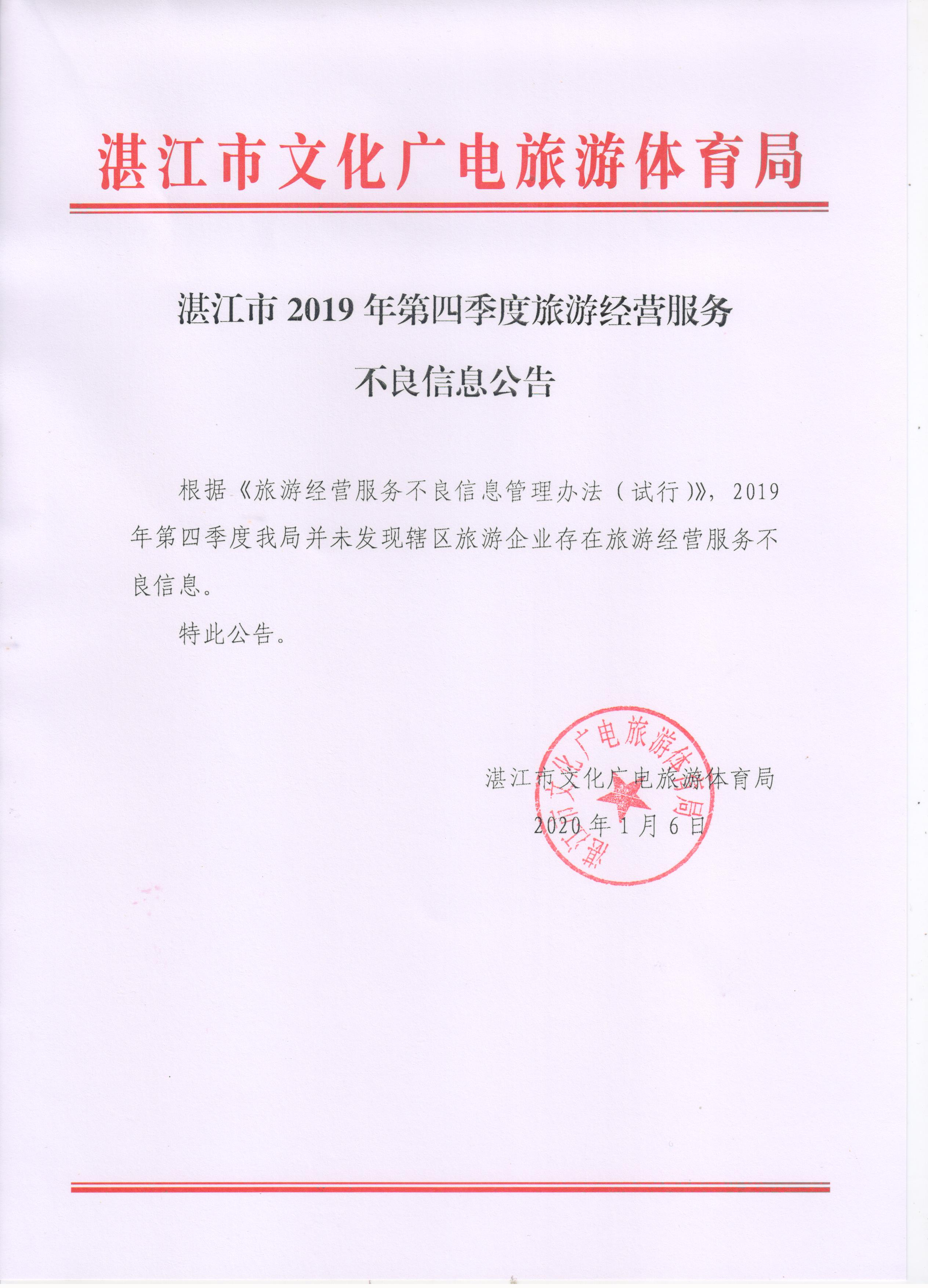 湛江市2019年第四季度旅游經(jīng)營(yíng)服務(wù)不良信息公告