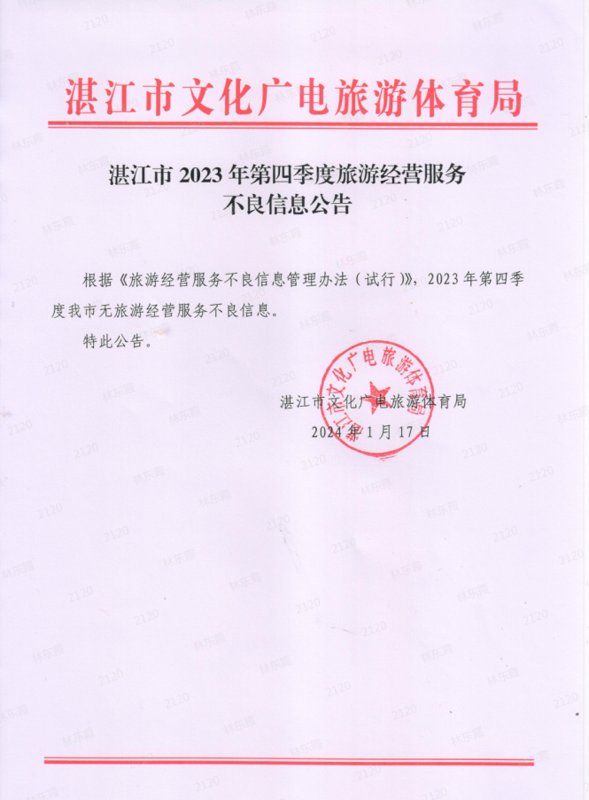 湛江市2023年第四季度旅游經(jīng)營服務(wù)不良信息公告