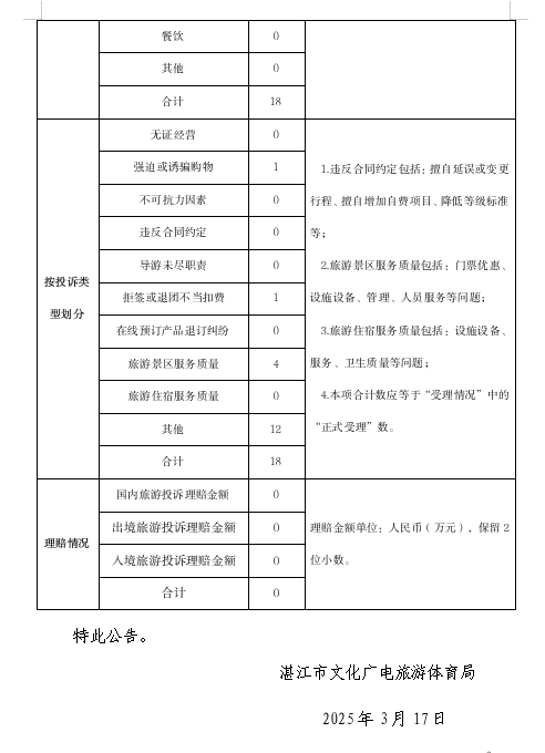 湛江市文化廣電旅游體育局2025年第1季度旅游投訴通告
