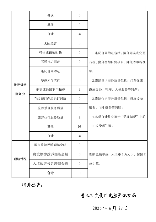 湛江市文化廣電旅游體育局2025年第2季度旅游投訴通告