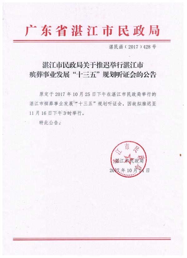 湛江市民政局關(guān)于推遲舉行湛江市殯葬事業(yè)發(fā)展“十三五”規(guī)劃聽證會的公告