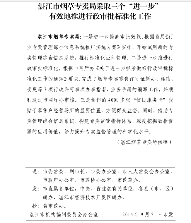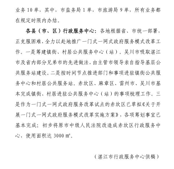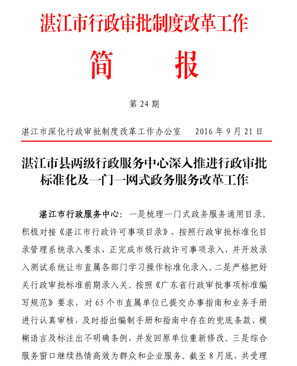 湛江市縣兩級行政服務(wù)中心深入推進(jìn)行政審批標(biāo)準(zhǔn)化及一門一網(wǎng)式政務(wù)服務(wù)改革工作