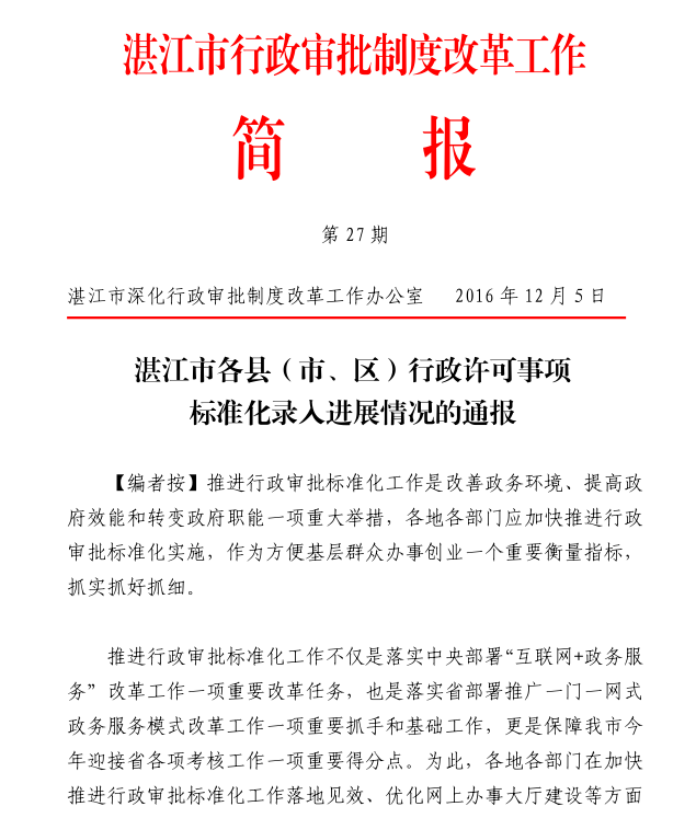 湛江市行政審批制度改革工作簡(jiǎn)報(bào)第27期