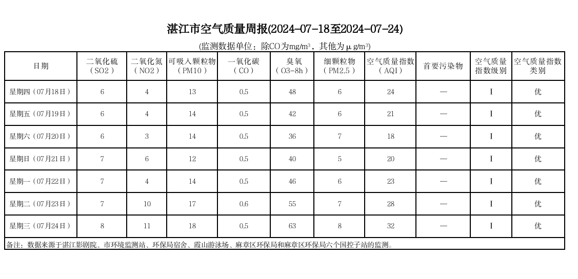 湛江市空氣質(zhì)量周報(2024-07-18至2024-07-24)