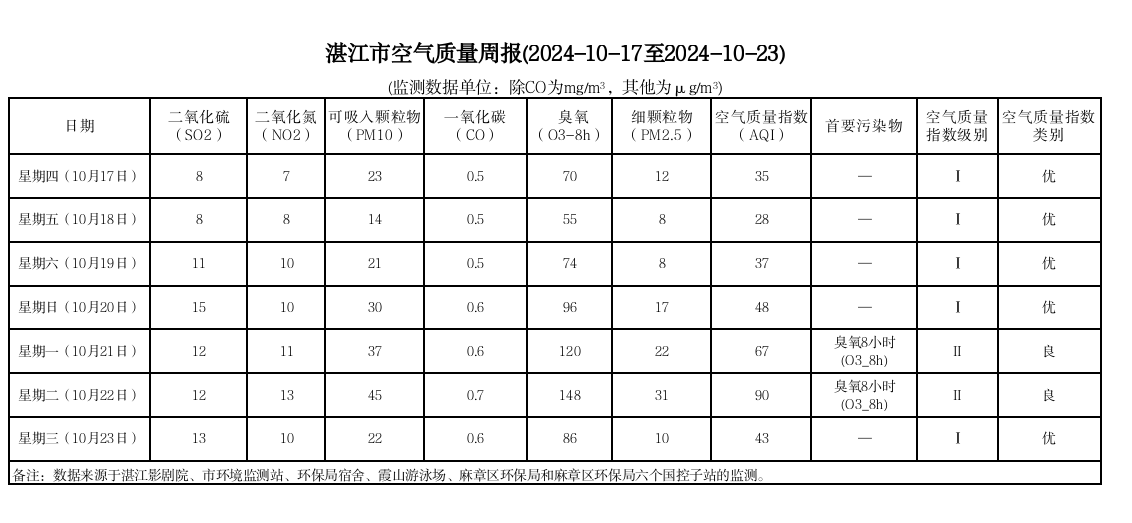 湛江市空氣質(zhì)量周報(bào)(2024-10-17至2024-10-23)