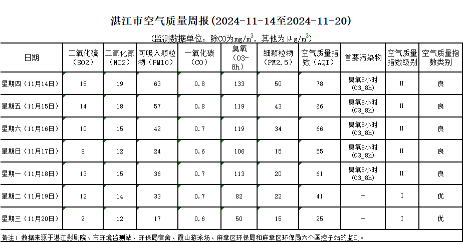湛江市空氣質(zhì)量周報(2024-11-14至2024-11-20)