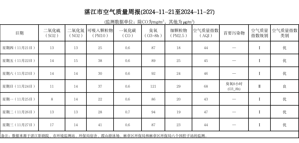 湛江市空氣質(zhì)量周報(2024-11-21至2024-11-27)