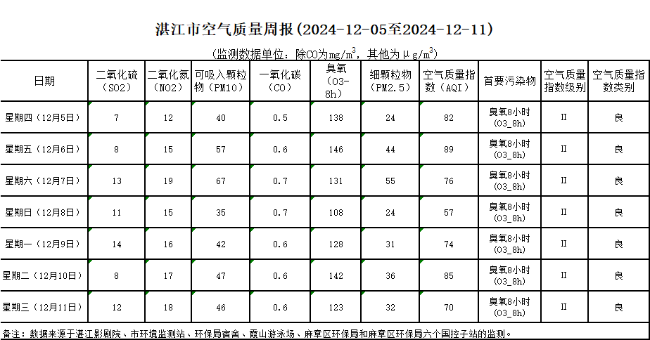 湛江市空氣質(zhì)量周報(bào)(2024-12-05至2024-12-11)