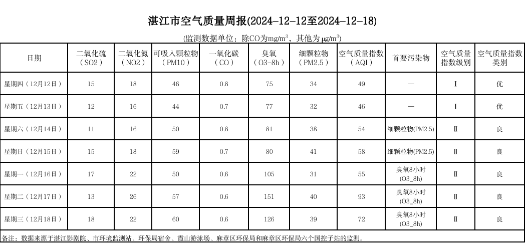湛江市空氣質(zhì)量周報(bào)(2024-12-12至2024-12-18)