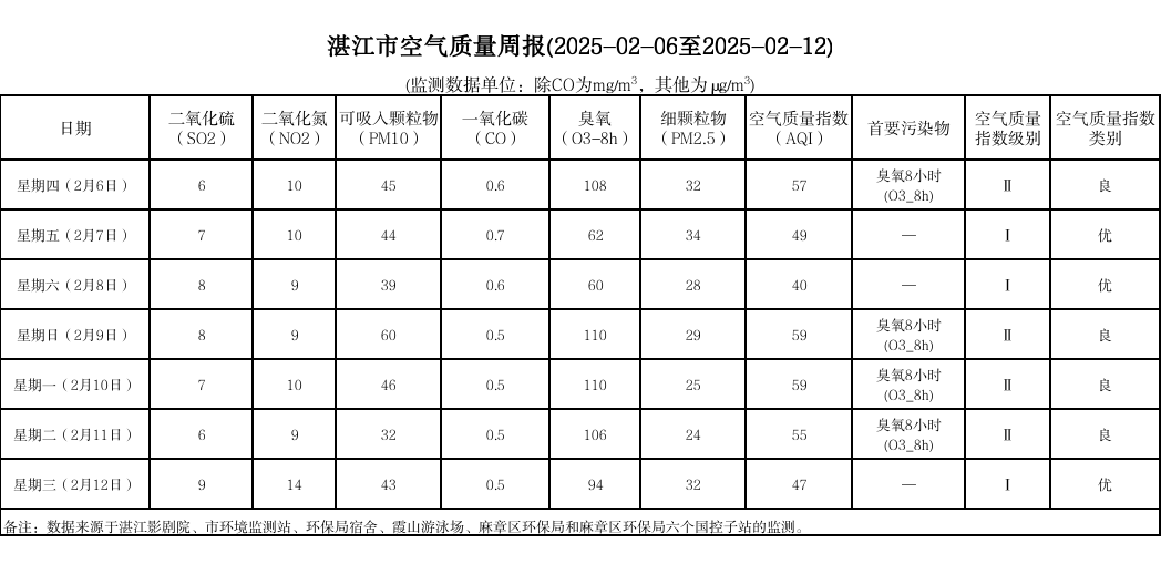 湛江市空氣質(zhì)量周報(bào)(2025-02-06至2025-02-12)