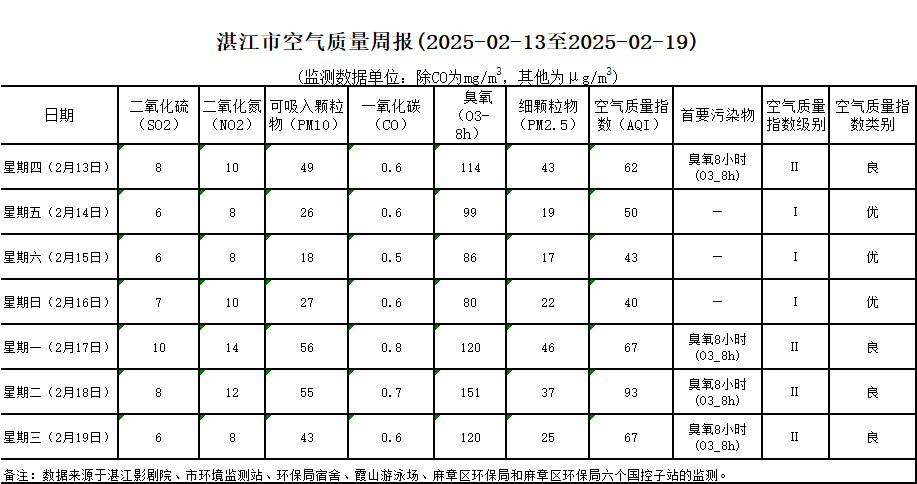 湛江市空氣質(zhì)量周報(2025-02-13至2025-02-19)