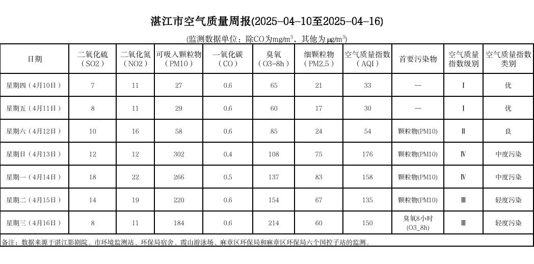 湛江市空氣質(zhì)量周報(bào)(2025-04-10至2025-04-16)