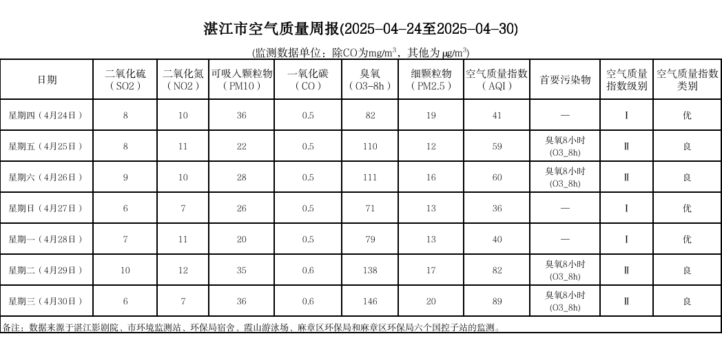 湛江市空氣質(zhì)量周報(2025-04-24至2025-04-30)