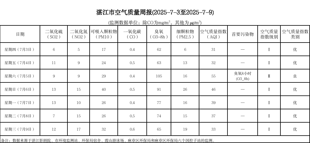 湛江市空氣質(zhì)量周報(2025-07-03至2025-07-09)