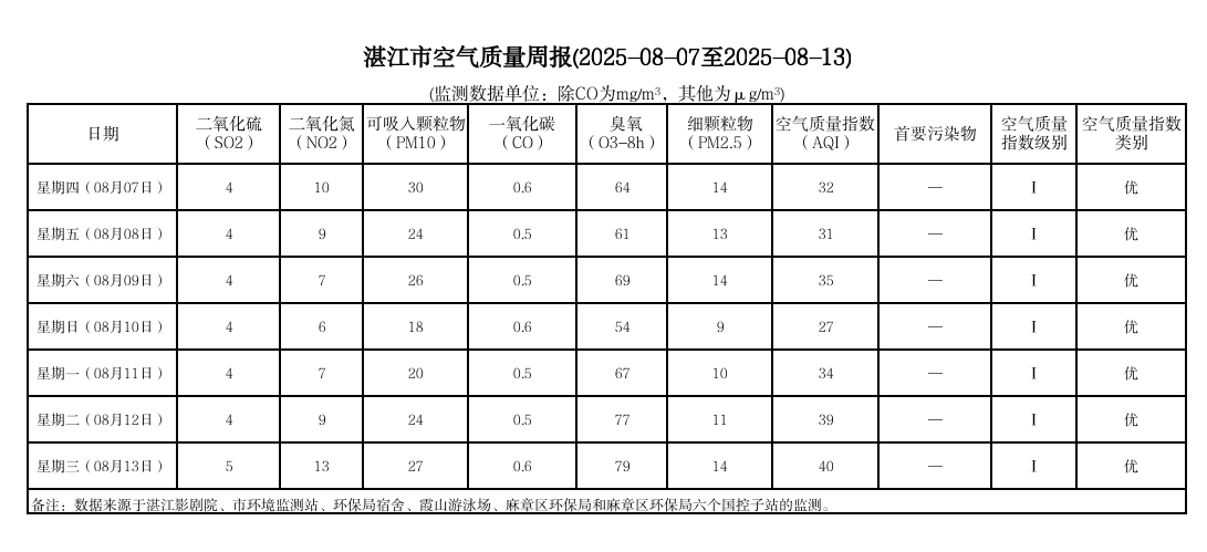 湛江市空氣質(zhì)量周報(bào)(2025-08-07至2025-08-13)