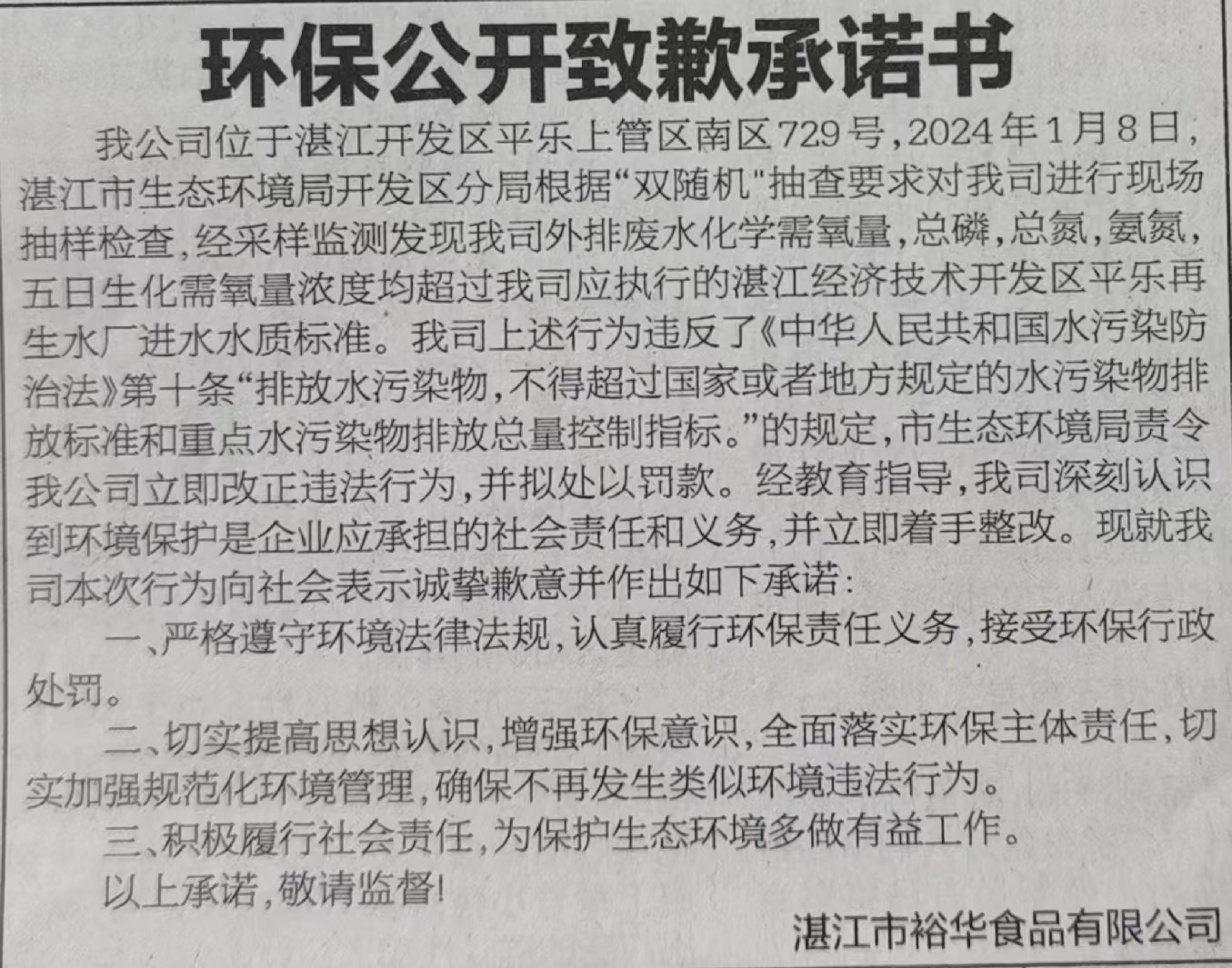湛江市裕華食品有限公司于2024年3月7日在湛江日報(bào)公開道歉,作出履行行政處罰決定和環(huán)保守法承諾。