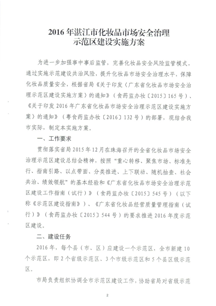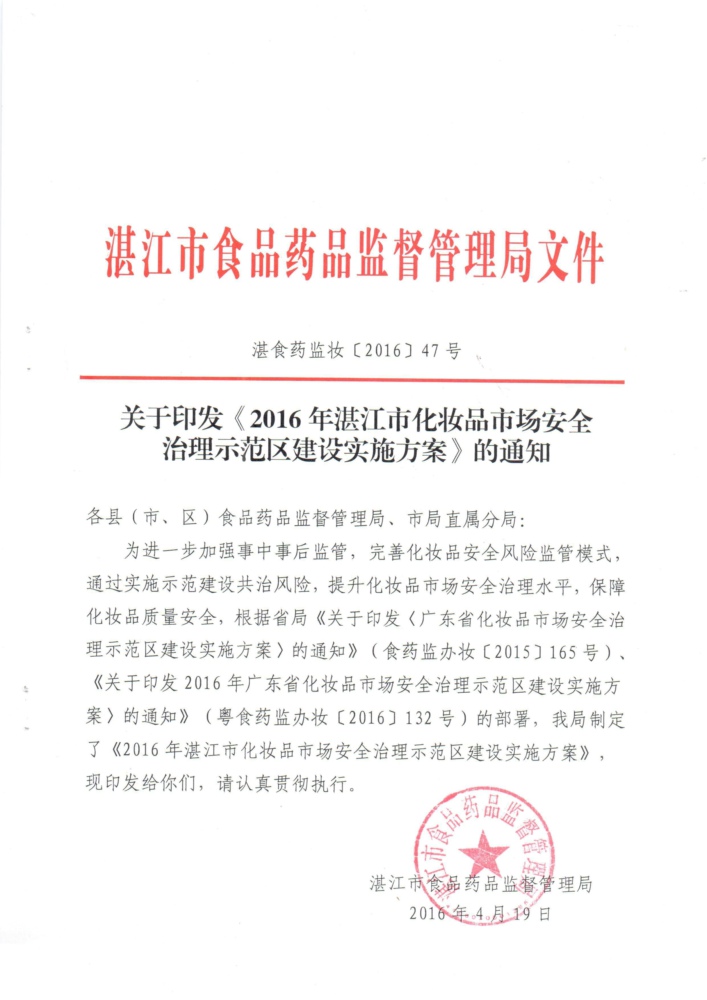 關(guān)于印發(fā)《2016年湛江市化妝品市場安全治理示范區(qū)建設(shè)實(shí)施方案》的通知