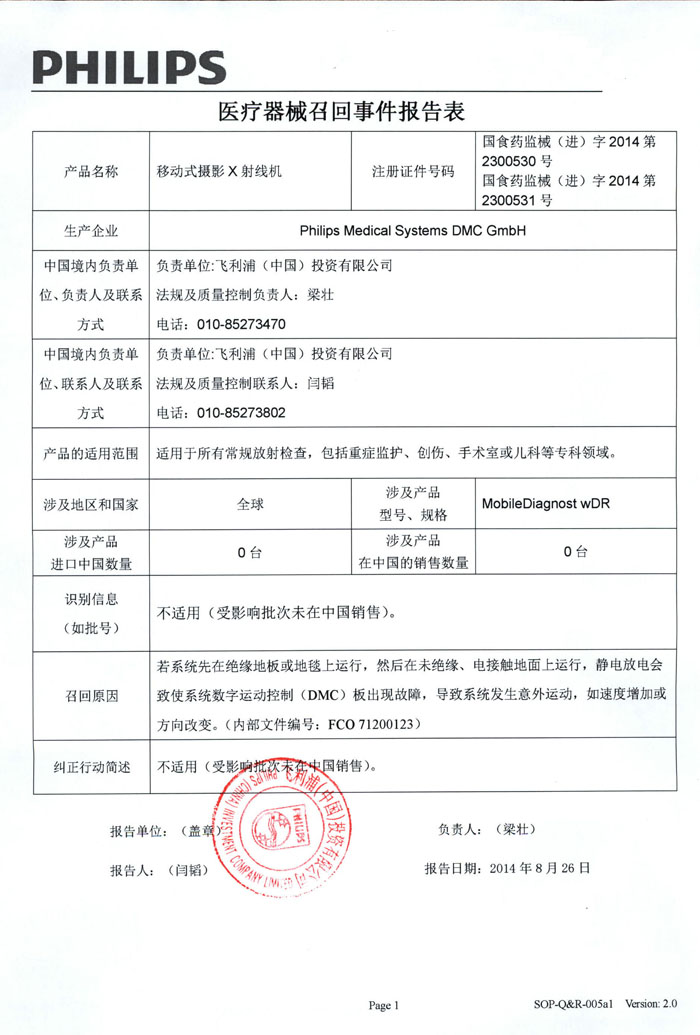2014年9月1日收到飛利浦(中國)投資有限公司報告,該公司代理的移動式攝影X射線機(jī)(注冊證號:國食藥監(jiān)械(進(jìn))字2014第2300530號、國食藥監(jiān)械(進(jìn))字2014第2300531號)由于在特定情況下系統(tǒng)數(shù)字運動控制板出現(xiàn)故障等原因,其生產(chǎn)商德國Philips Medical Systems DMC GmbH公司對該產(chǎn)品進(jìn)行主動召回。該公司稱此次召回產(chǎn)品未在中國銷售。請各省、自治區(qū)、直轄市食品藥品監(jiān)督管理局加強(qiáng)對此類產(chǎn)品的監(jiān)督管理。