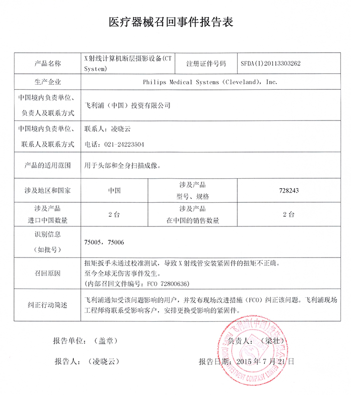 飛利浦(中國)投資有限公司對X射線計算機斷層攝影設(shè)備主動召回
