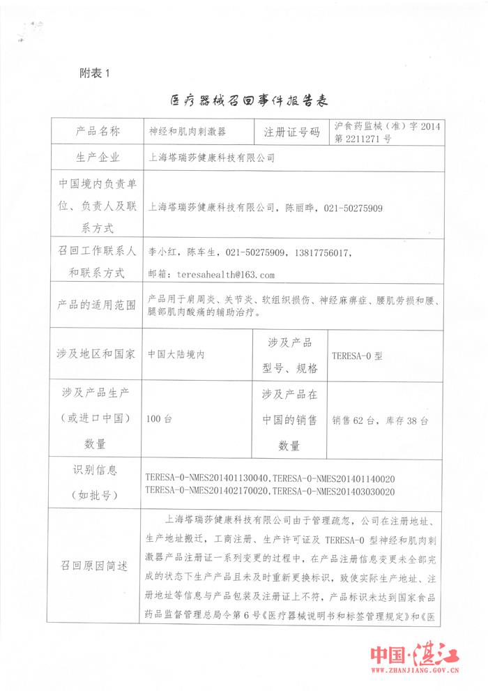 上海塔瑞沙健康科技有限公司對神經(jīng)和肌肉刺激器主動召回