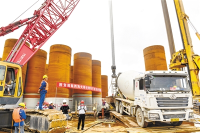 16日,調(diào)順跨海大橋主墩鉆孔樁開始灌漿。郎樹臣 攝