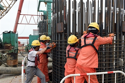 工人在東雷高速通明海特大橋橋墩開展鋼筋作業(yè)。? 鄭鋒 攝
