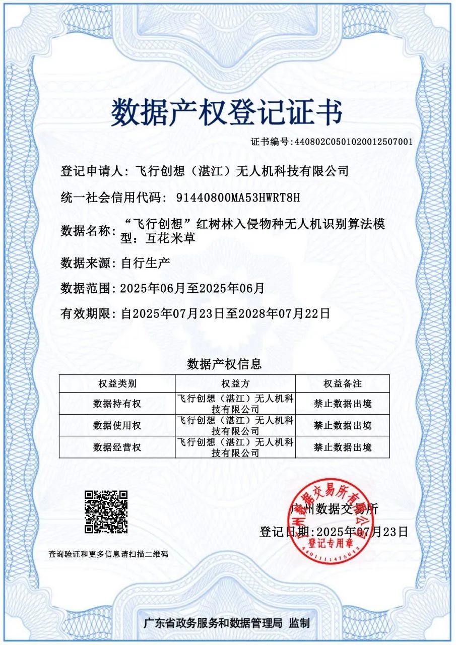 據(jù)了解,此次“‘飛行創(chuàng)想’紅樹林入侵物種無(wú)人機(jī)識(shí)別算法模型”在廣州數(shù)據(jù)交易所完成數(shù)據(jù)產(chǎn)權(quán)登記,意義重大。這一登記不僅明確了算法模型的產(chǎn)權(quán)歸屬,為其推廣應(yīng)用提供了公信力保障,更標(biāo)志著湛江在“人工智能+生態(tài)保護(hù)”領(lǐng)域的技術(shù)創(chuàng)新成果邁出了規(guī)范化、市場(chǎng)化的重要一步。