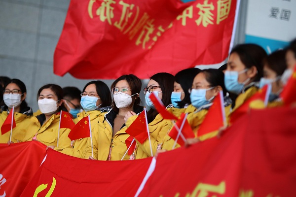 在偉大抗疫斗爭(zhēng)中,14億人民顯示出高度的責(zé)任意識(shí)、自律觀念、奉獻(xiàn)精神、友愛(ài)情懷,鑄就起強(qiáng)大精神防線。國(guó)有難,召必應(yīng),全國(guó)4.26萬(wàn)名醫(yī)務(wù)人員不畏艱險(xiǎn)、義無(wú)反顧馳援湖北,攜手并進(jìn)、共克時(shí)艱。圖為2月21日,即將奔赴武漢的第五批國(guó)家中醫(yī)醫(yī)療隊(duì)(江蘇)在南京南站整裝待發(fā)。(圖片來(lái)源:人民視覺(jué))