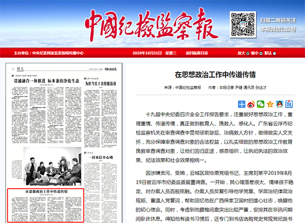 十九屆中央紀委四次全會工作報告要求,注重做好思想政治工作,重理重情、傳道傳情,真正做到教育人、挽救人、感化人。廣東省云浮市紀檢監(jiān)察機關在審查調(diào)查中貫徹懲前毖后、治病救人方針,做細做實人文關懷,充分保障審查調(diào)查對象的合法權(quán)益,以扎實細致的思想政治工作教育挽救審查調(diào)查對象,讓他們回歸正途,感恩組織,讓執(zhí)紀執(zhí)法的政治效果、紀法效果和社會效果相統(tǒng)一。
