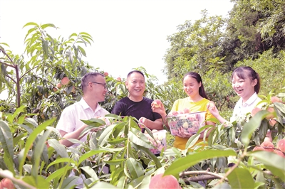 四川省古藺縣向重點(diǎn)村選派駐村工作隊(duì),讓干部在鄉(xiāng)村振興一線服務(wù)群眾、增長(zhǎng)才干、施展抱負(fù)。圖為縣紀(jì)委監(jiān)委駐村工作隊(duì)隊(duì)員在千畝“秋燕香桃”種植基地與果農(nóng)一起采摘香桃。蘇海鵬 攝