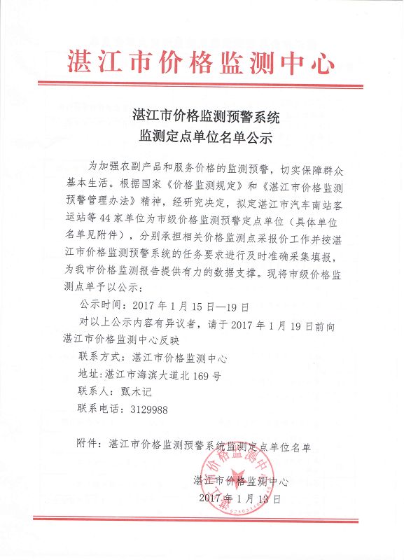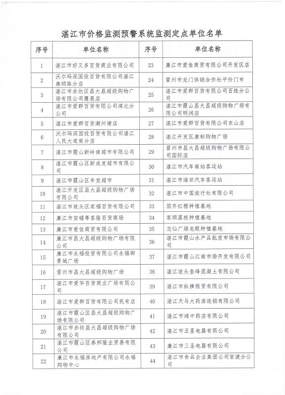 湛江市價(jià)格監(jiān)測預(yù)警系統(tǒng)監(jiān)測定點(diǎn)單位名單公示